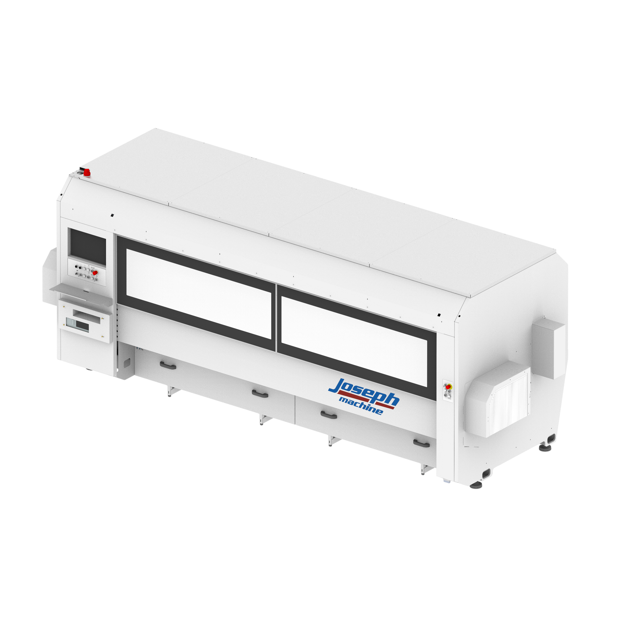 The jCNC PHOENIX is a high-precision CNC machining center with a 3-axis tooling head plus a servo-driven rotating work bed, providing a total of 4 controlled axes. Built on a solid electro-welded steel frame for maximum stability, it is designed for precision processing of aluminum, PVC, light alloys, and other extrusions. The rotating bench pivots to 90°, 0°, and -90° for multi-side machining without repositioning the profile, increasing efficiency and accuracy. Controlled by a Siemens industrial PC running dedicated software with a Windows interface, the PHOENIX offers intuitive programming, CAD/CAM integration, and optional pendulum working for continuous production. An automatic tool changer with 7 positions (optional 10) supports flexible fabrication, while four adjustable clamps secure workpieces of varying lengths, including bars longer than the machine itself.